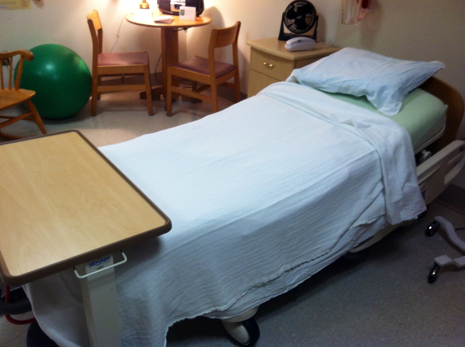 And last, there was the bed, which was your typical hospital bed – nothing too fancy, and could only fit one person. However, the nurse did say that beds are rolled in for partners to sleep on. I thought that was sweet. Mind you, I don’t know anyone who would LIKE to sleep in a hospital bed, but from what I hear – very little sleeping goes on during these hours of one’s life.