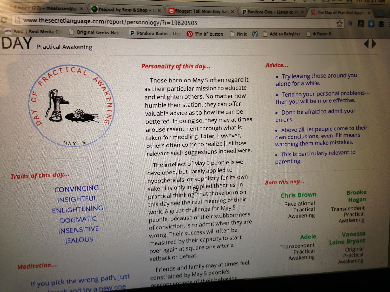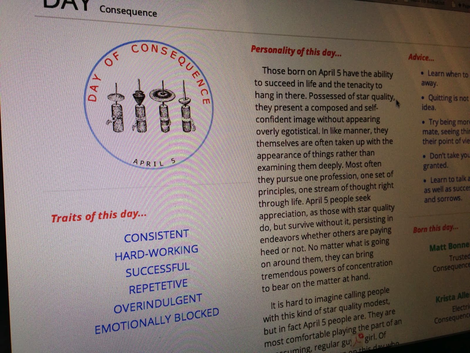 So in the theme of birthdays, seven month birthdays, and half birthdays, Tall Dad, myself, and a couple friends decided to play around on a site called The Secret Language of Birthdays. The claim to fame for this site is that it can apparently reveal personality traits based upon one’s birthday (or, name day, for all of you Game of Thrones fans.)
